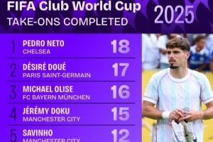 体育资讯7月11日讯 本届世俱杯仅剩巴黎vs切尔西的决赛,数据机构squakwa也统计了本届赛事成功过人情况,切尔西3将上榜。