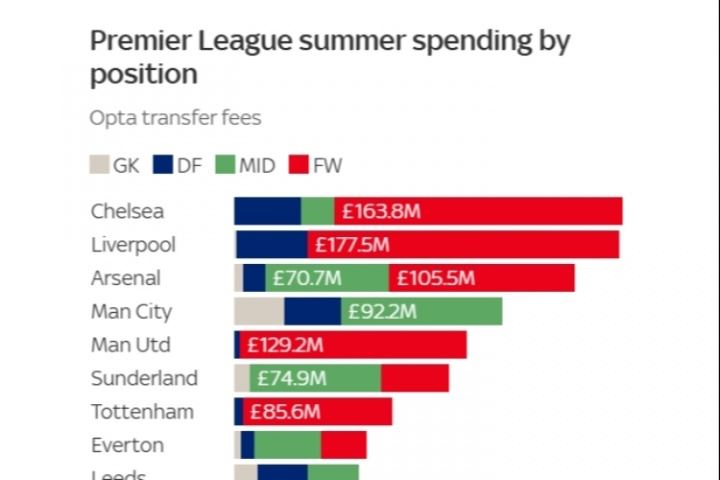 据统计,利物浦是今夏在前锋位置上引援花费最多的球队,共花了1.78亿镑,切尔西1.64亿镑排在第二,曼联、阿森纳、热刺分列3-5,曼城则还没有在锋线进行任何引援。