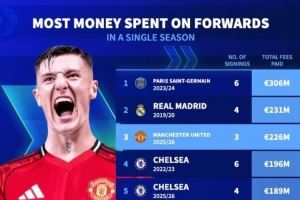 附单一赛季锋线引援花费榜: