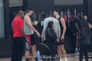气氛欢乐备战揭幕战!杨瀚森手拿饮料跟助教说笑