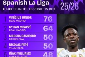 西甲禁区触球数排行:维尼修斯76次居首 姆巴佩第2、拉什福德第3
